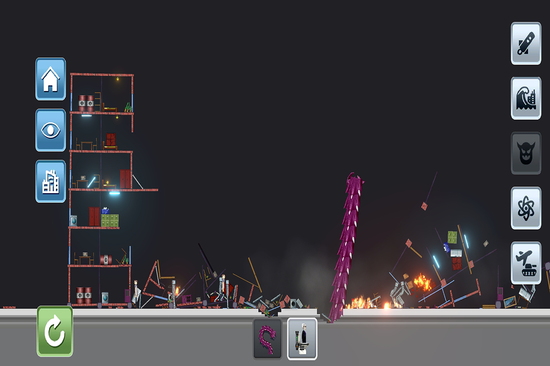 玩家可以自由选择多种毁灭性武器,包括核弹、导弹、黑洞发生器、高能激光和毁灭性闪电,每种武器都有独特的破坏方式和视觉特效,满足你对“毁灭美学”的所有想象。